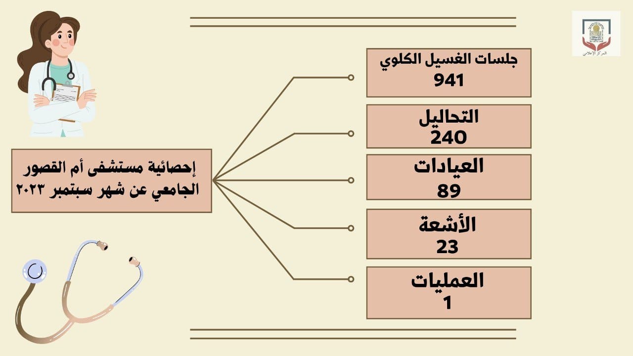 أعلن مستشفى أم القصور بجامعة أسيوط؛ إجراء (٩٤١) جلسة غسيل كلوي خلال شهر سبتمبر الماضي، تحت رعاية الدكتور أحمد المنشاوي رئيس الجامعة، والدكتور علاء عطية عميد كلية الطب ورئيس مجلس إدارة المستشفيات الجامعية، والدكتور إيهاب فوزي المدير التنفيذي للمستشفيات الجامعية، والدكتور عامر رجب أحمد مدير المستشفى، وبإشراف الدكتورة عفت عبد الهادي رئيس وحدة الكلى الصناعي بالمستشفيات الجامعية.