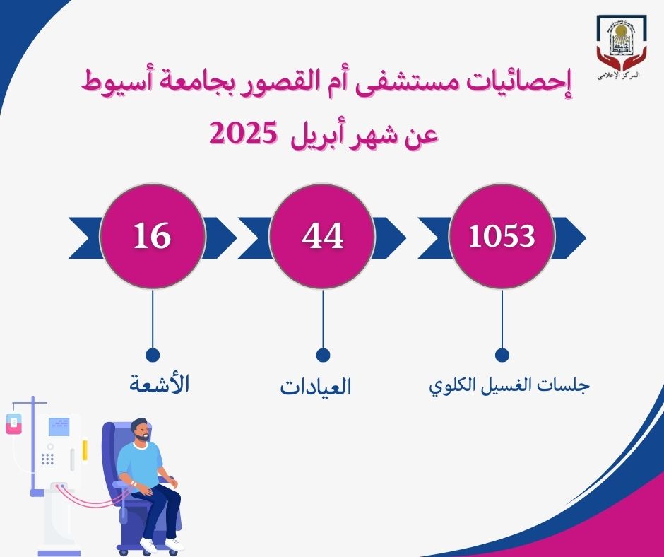 Um Al-Qusour Hospital at Assiut University announced that it performed (1053) dialysis sessions during the month of April, under the auspices of Professor. Ahmed El-Minshawi, the President of the University, Professor. Alaa Attia, the Dean of the Faculty of Medicine and Chairman of the Board of University Hospitals, and Professor. Amer Ragab Ahmed, the Director of the Hospital, with supervision from Professor. effat Abdul-Hadi, Head of the Artificial Kidney Unit at the University Hospitals.