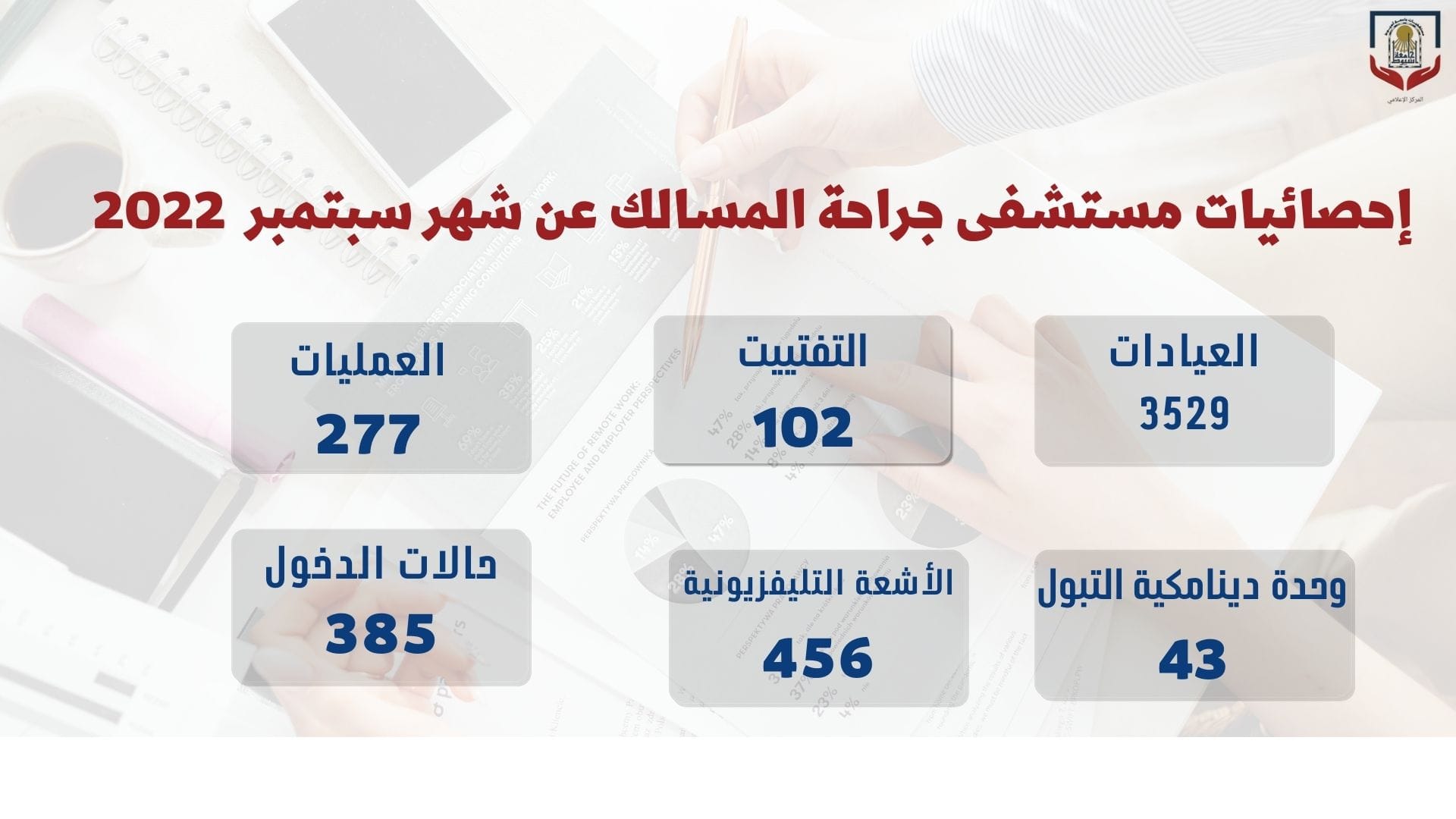 وأعلن الأستاذ الدكتور ضياء عبد الحميد مدير المستشفى عن استقبال ٣٨٥ حالة، واستقبال ٤٣ حالة بوحدة دينامكية التبول، وتم إجراء ٤٥٦ إشاعة تليفزيونية، وإجراء ١٠٢ حالة تفتييت.