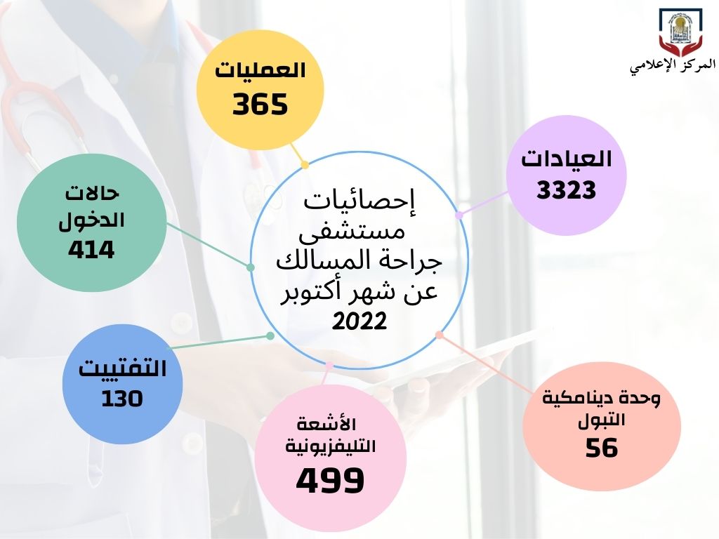 تحت رعاية الأستاذ الدكتور أحمد المنشاوي القائم بأعمال رئيس الجامعة، والأستاذ الدكتور علاء عطية عميد كلية الطب ورئيس مجلس إدارة المستشفيات الجامعية، والأستاذ الدكتور إيهاب فوزي المدير التنفيذي للمستشفيات الجامعية استقبل مستشفى جراحة المسالك ٣٣٢٣ حالة بالعيادات وإجرى ٣٦٥ عملية خلال شهر أكتوبر.
