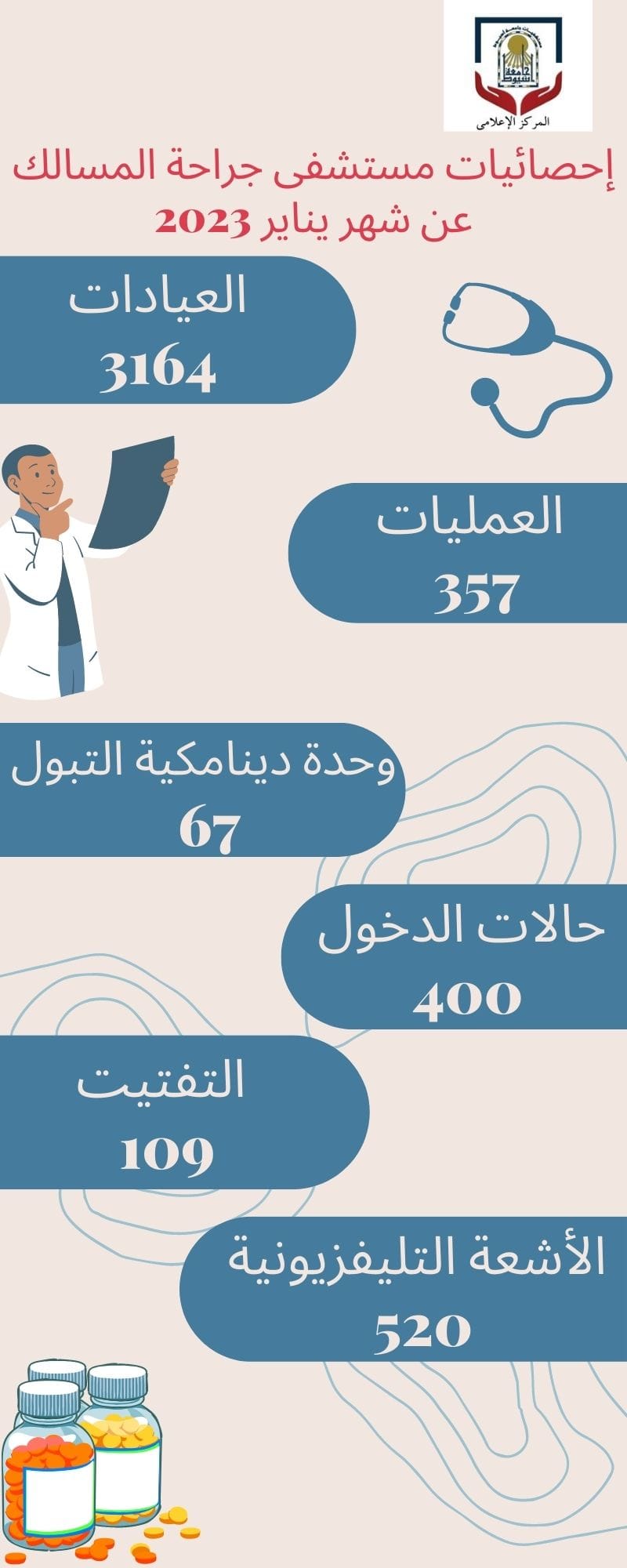 كما استقبل مستشفى جراحة المسالك البولية ٤٠٠ حالة دخول بالأقسام والوحدات المختلفة، و٦٧ حالة بوحدة دينامكية التبول، كما تم إجراء ٥٢٠ إشاعة تليفزيونية، وإجراء ١٠٩حالة تفتييت.