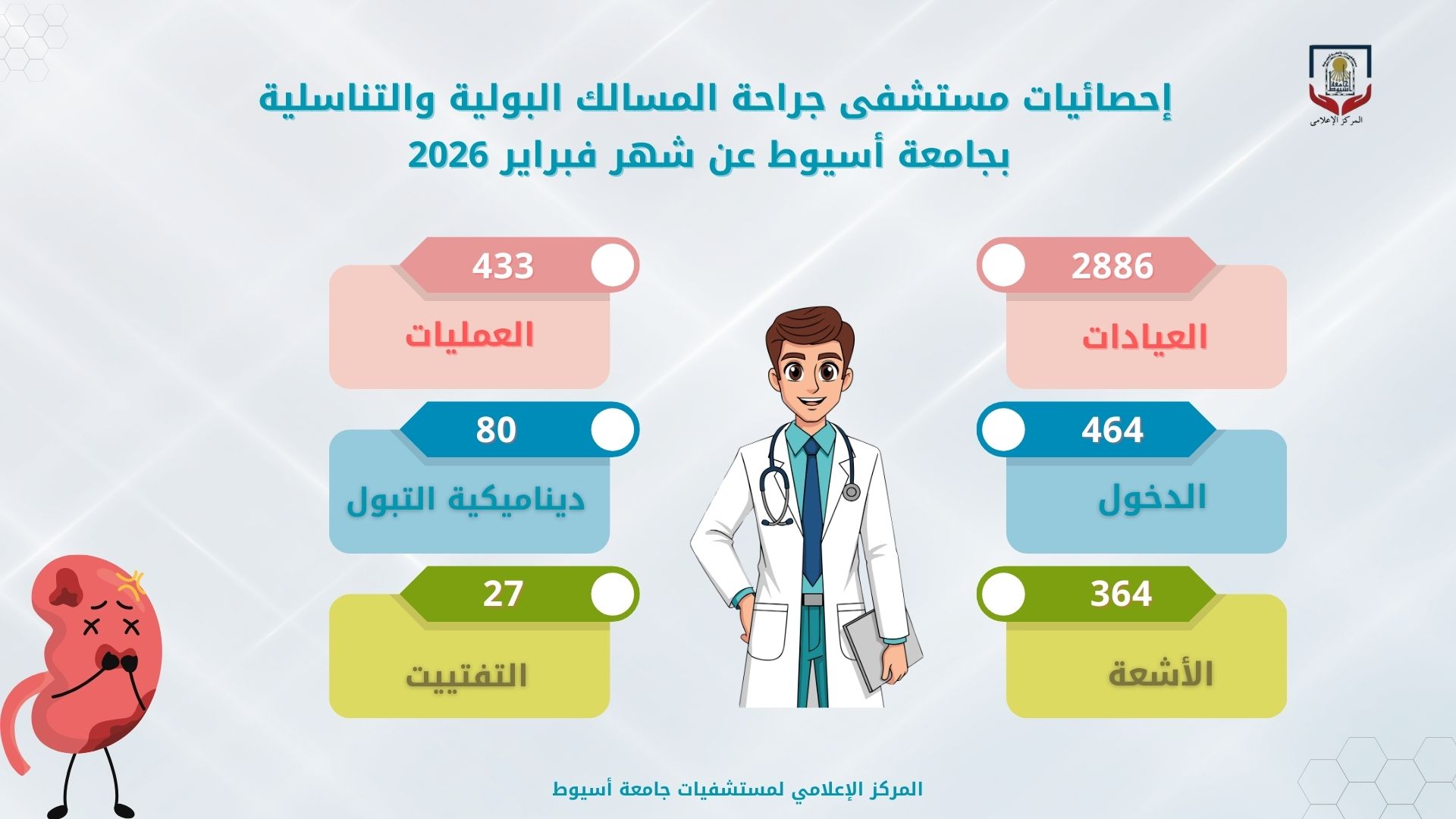 The Urology and Andrology Hospital at Assiut University received 2,886 outpatients during February, under the auspices of Professor Dr. Ahmed El-Menshawy, President of the University; Professor Dr. Alaa Attia, Dean of the Faculty of Medicine and Chairman of the Board of Directors of University Hospitals; and Professor Dr. Diaa Abdel-Hamid, Director of the Hospital.