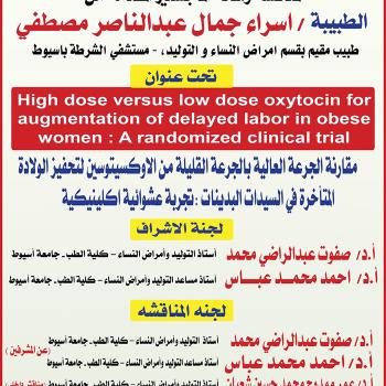 مناقشة رسالة ماجستير للطبيبة / اسراء جمال عبد الناصر الأثنين الموافق 20 سبتمبر