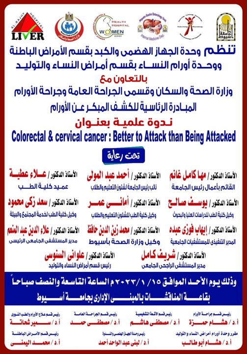 في إطار المبادرة الرئاسية للكشف المبكر عن الأورام تنظم وحدة الجهاز الهضمي والكبد بقسم الأمراض الباطنة ووحدة أورام النساء بقسم أمراض النساء والتوليد بالتعاون مع وزارة الصحة والسكان وقسمي الجراحة العامة وجراحة الأورام ندوة علمية تحت عنوان "أورام القولون.. من الأفضل الهجوم قبل التعرض للهجوم"، وذلك يوم الأحد الموافق ١٥ يناير بالمبني الإداري بجامعة أسيوط،