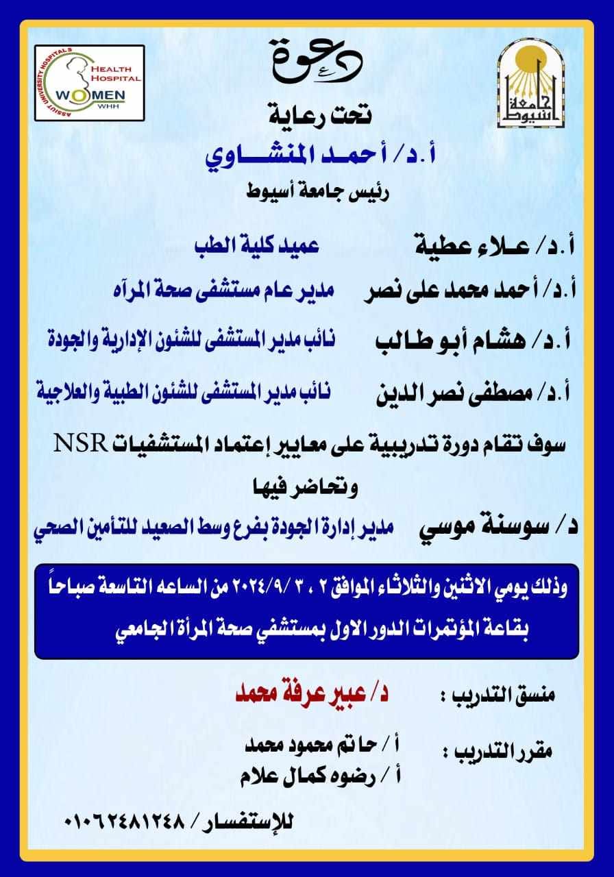 Women's Health Hospital at Assiut University is organizing a training course on hospital accreditation standards "NSR" during the days of September 2-3, under the patronage of Professor Dr. Ahmed El-Minshawy, President of the University, Professor Dr. Alaa Attia, Dean of the Faculty of Medicine and Chairman of the Board of Directors of University Hospitals, and Professor Dr. Ahmed Nasr, Director of the Hospital. Under the supervision of Professor Dr. Hisham Abu Talib, Deputy Director of the Hospital for Administrative and Quality Affairs, and Professor Dr. Mustafa Nasr El-Din, Deputy Director of the Hospital for Medical and Therapeutic Affairs.