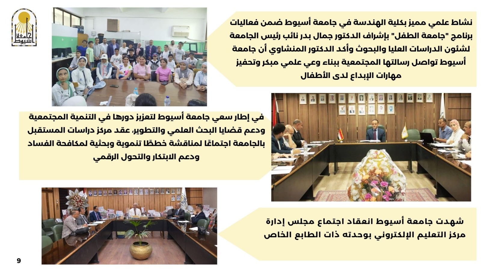 نشاط علمي مميز بكلية الهندسة في جامعة أسيوط ضمن فعاليات برنامج "جامعة الطفل"  بإشراف الدكتور جمال بدر نائب رئيس الجامعة لشئون الدراسات العليا والبحوث وأكد الدكتور المنشاوي أن جامعة أسيوط تواصل رسالتها المجتمعية ببناء وعي علمي مبكر وتحفيز مهارات الإبداع لدى الأطفال