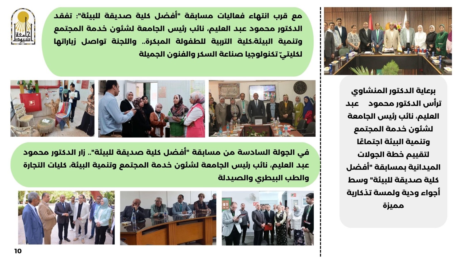 برعاية الدكتور المنشاوي ترأس  الدكتور محمود عبد العليم، نائب رئيس الجامعة لشئون خدمة المجتمع وتنمية البيئة اجتماعًا لتقييم خطة الجولات الميدانية بمسابقة "أفضل كلية صديقة للبيئة" وسط أجواء ودية ولمسة تذكارية مميزة