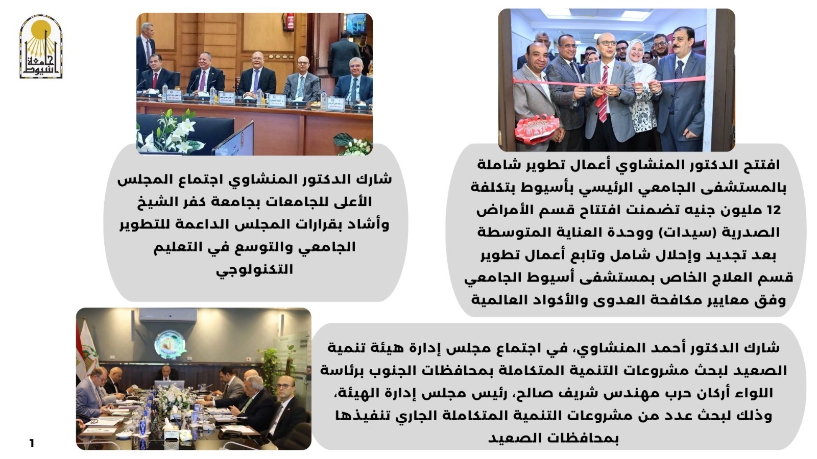 افتتح الدكتور المنشاوي أعمال تطوير شاملة بالمستشفى الجامعي الرئيسي بأسيوط بتكلفة 12 مليون جنيه تضمنت افتتاح قسم الأمراض الصدرية (سيدات) ووحدة العناية المتوسطة بعد تجديد وإحلال شامل وتابع أعمال تطوير قسم العلاج الخاص بمستشفى أسيوط الجامعي وفق معايير مكافحة العدوى والأكواد العالمية