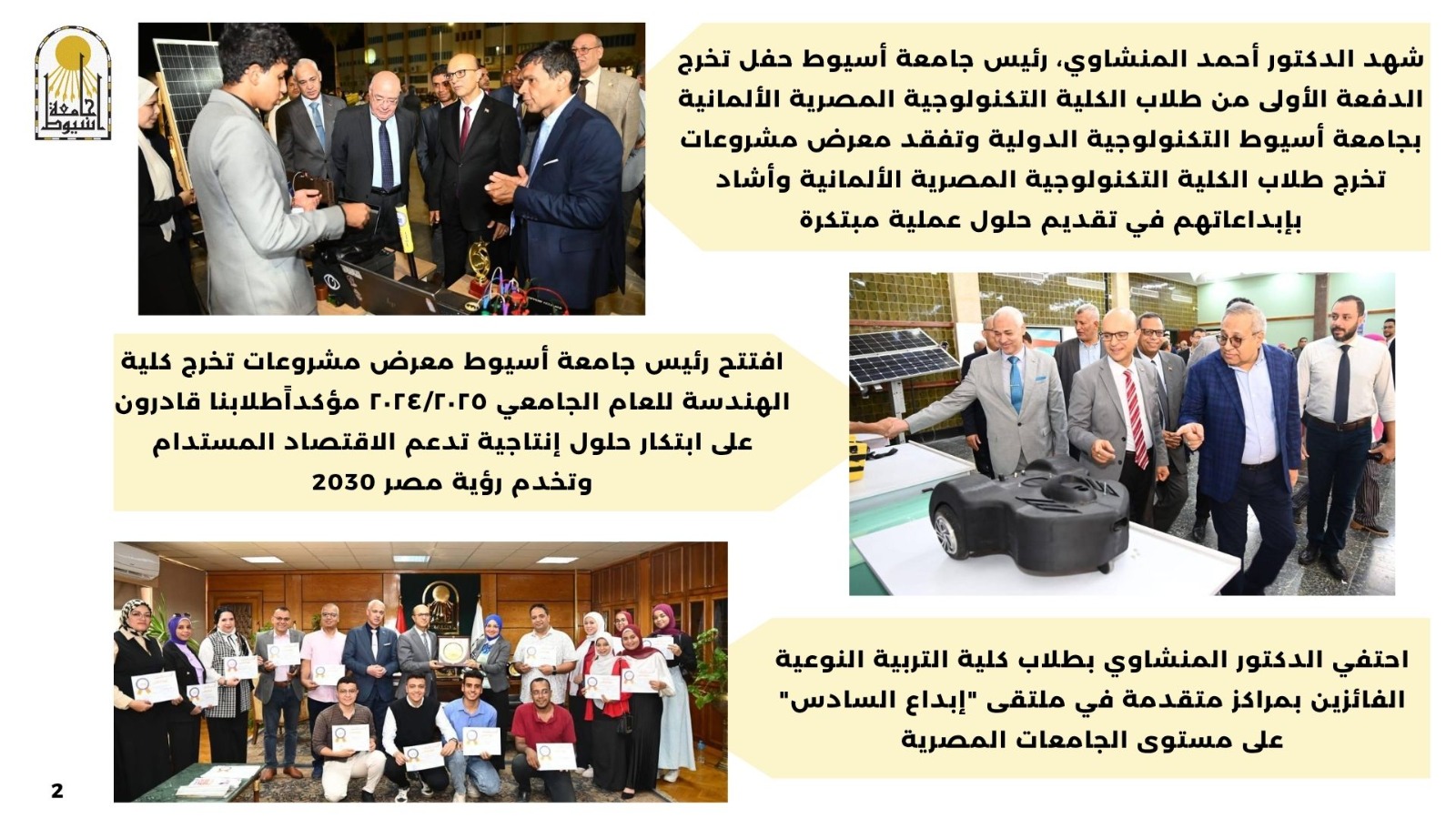 افتتح رئيس جامعة أسيوط معرض مشروعات تخرج كلية الهندسة للعام الجامعي ٢٠٢٤/٢٠٢٥ مؤكداً  طلابنا قادرون على ابتكار حلول إنتاجية تدعم الاقتصاد المستدام وتخدم رؤية مصر 2030