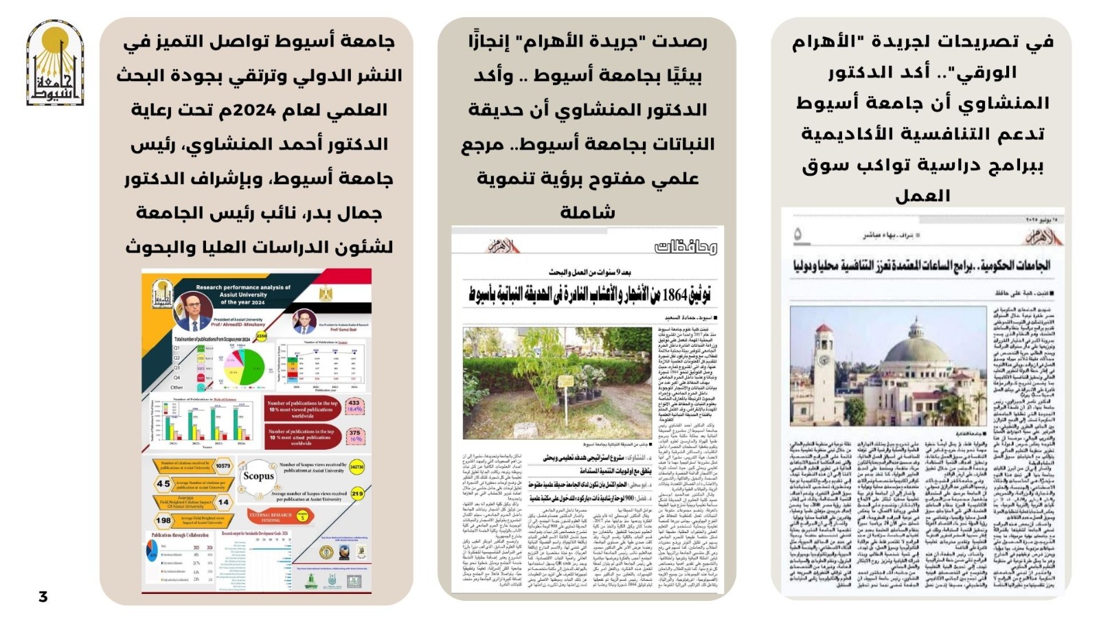 رصدت "جريدة الأهرام" إنجازًا بيئيًا بجامعة أسيوط .. وأكد الدكتور المنشاوي أن  حديقة النباتات بجامعة أسيوط.. مرجع علمي مفتوح برؤية تنموية شاملة