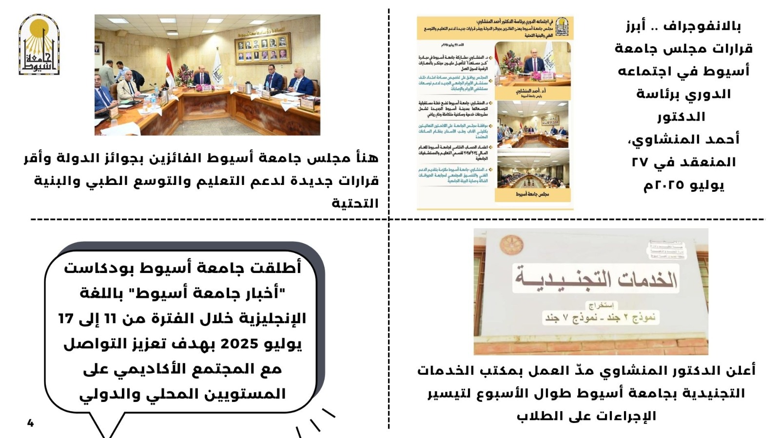 شهدت جامعة أسيوط العديد من الفعاليات والأنشطة خلال أسبوع في الفترة من 26  يوليو حتى  31  يوليو 2025