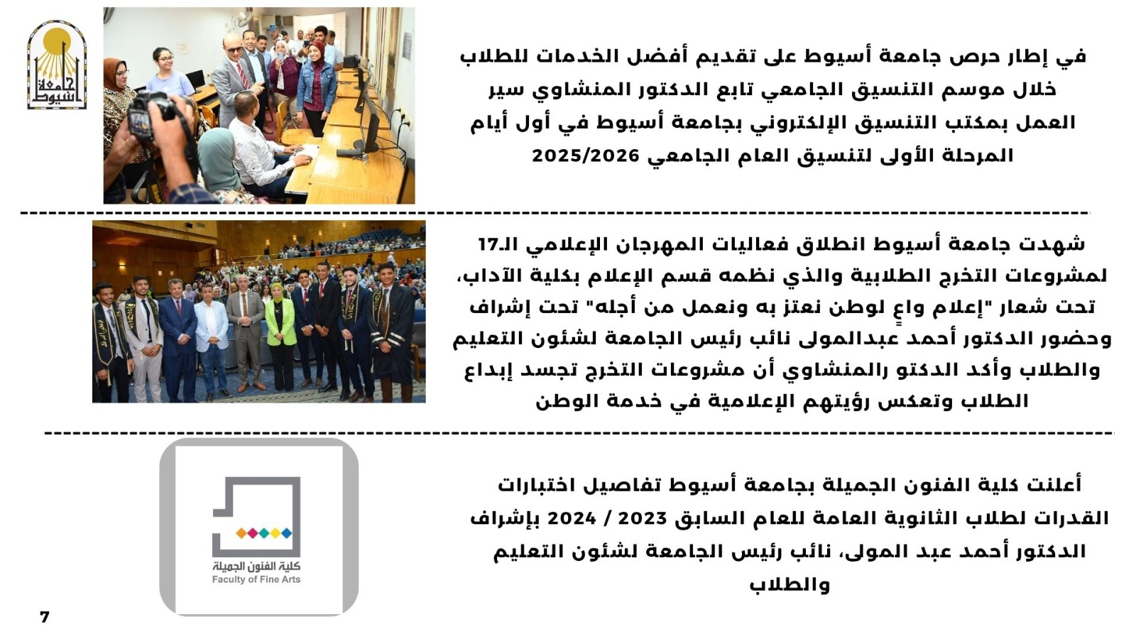 شهدت جامعة أسيوط انطلاق فعاليات المهرجان الإعلامي الـ17 لمشروعات التخرج الطلابية  والذي نظمه قسم الإعلام بكلية الآداب، تحت شعار "إعلام واعٍ لوطن نعتز به ونعمل من أجله" تحت إشراف وحضور الدكتور أحمد عبدالمولى نائب رئيس الجامعة لشئون التعليم والطلاب وأكد الدكتور  المنشاوي أن مشروعات التخرج تجسد إبداع الطلاب وتعكس رؤيتهم الإعلامية في خدمة الوطن