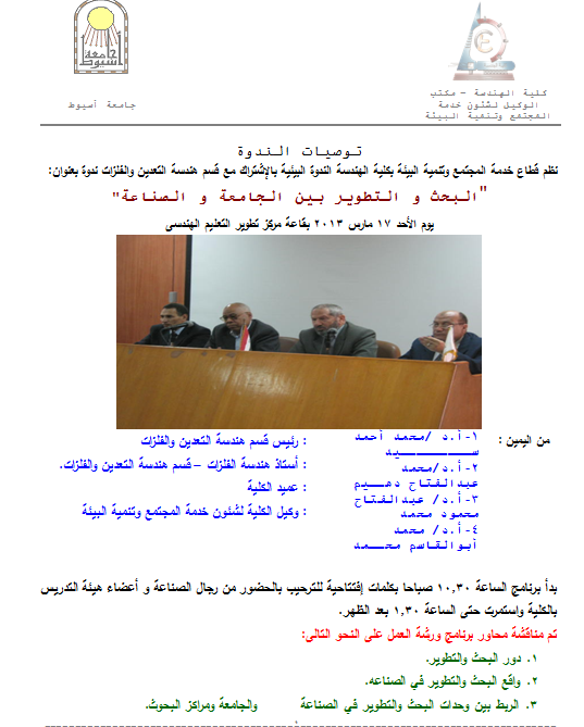 اهم توصيات ندوة تنمية البيئة بكلية الهندسة الخاصة بالبحث و التطوير بين الجامعة و الصناعة