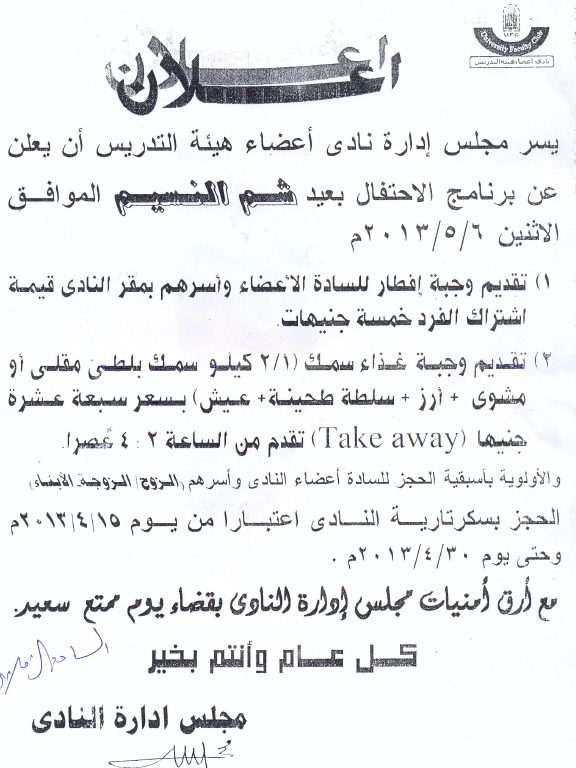 احتفلات نادى اعضاء هيئة التدريس بشم النسيم للسادة اعضاء هيئة التدريس 14 أبريل 2013 احتفلات نادى اعضاء هيئة التدريس بشم النسيم للسادة اعضاء هيئة التدريس