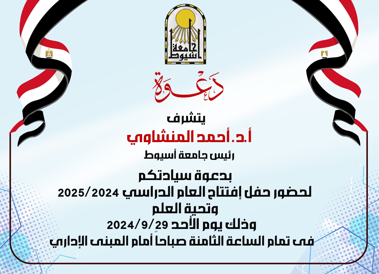 تنظم جامعة أسيوط، حفل افتتاح العام الدراسي 2024/ 2025، وتحية العلم، تحت رعاية الدكتور المنشاوى رئيس الجامعة؛ وإشراف: الدكتور أحمد عبد المولى نائب رئيس الجامعة لشئون التعليم والطلاب، وذلك يوم الأحد المقبل 29 سبتمبر، في تمام الساعة الثامنة صباحًا، أمام المبنى الإداري، والذى يعد تقليداً سنوياً تنظمه الجامعة، بالتعاون مع أسرة طلاب من أجل مصر، واتحاد طلاب الجامعة، وإدارة الجوالة بالإدارة العامة لرعاية الشباب، وذلك؛ لتعزيز روح الولاء، والانتماء، والمواطنة بين طلاب وطالبات جامعة أسيوط؛ وذلك بتنظيم: الدكتورة مديحة درويش عميد كلية الطب البيطري، والمُشرف العام على الأنشطة الطلابية بالجامعة، والدكتور هيثم إبراهيم مدير عام الإدارة العامة لرعاية الطلاب، ومديري الإدارات بالإدارة العامة لرعاية الطلاب.