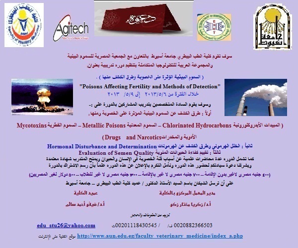 سوف تقوم كلية الطب البيطري جامعة أسيوط بالتعاون مع الجمعية المصرية للسموم البيئية والمجموعة العربية للتكنولوجيا المتكاملة بتنظيم دوره تدريبية بعنوان: