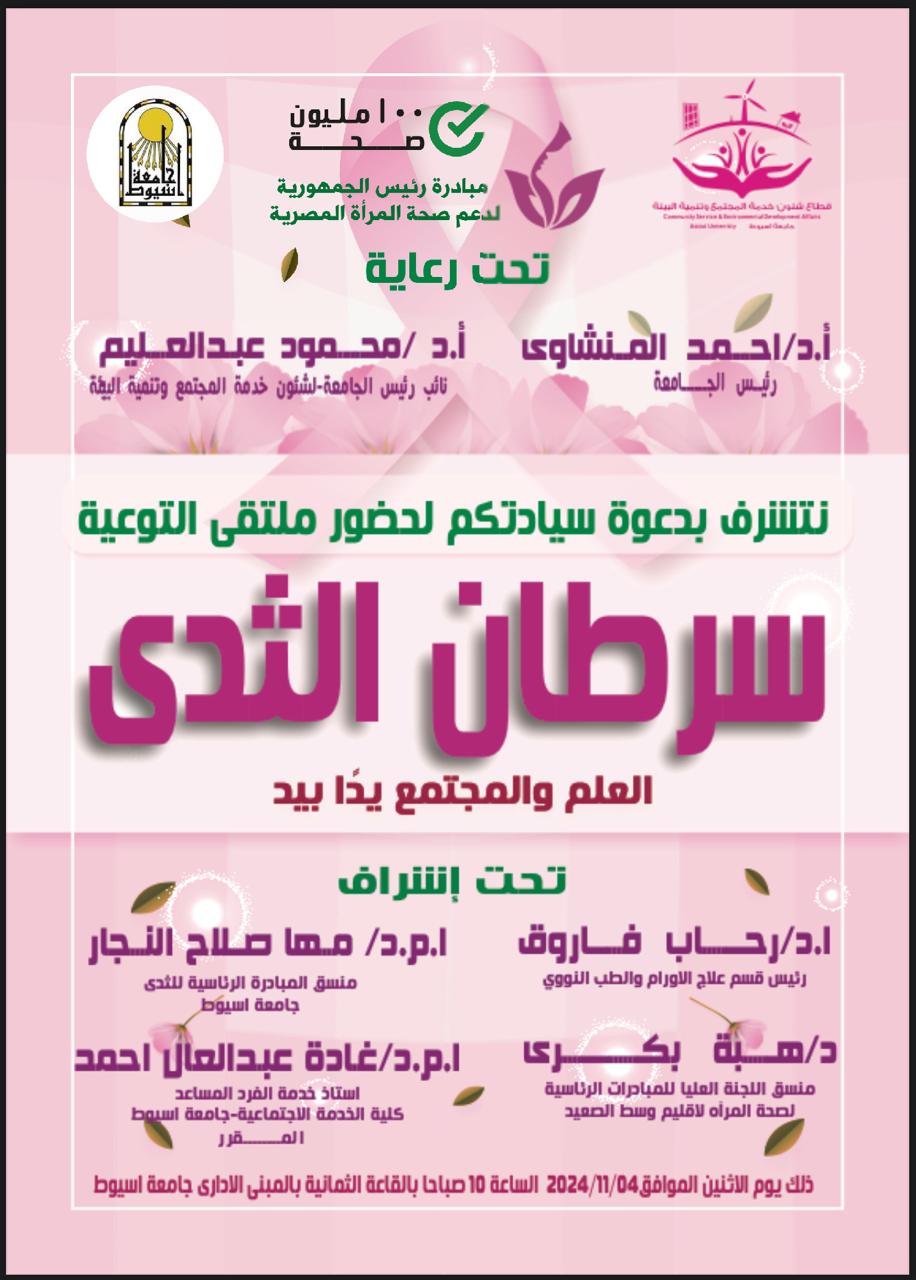 تحت رعاية الدكتور أحمدالمنشاوي رئيس جامعة أسيوط، يُنظم قطاع خدمة المجتمع وتنمية البيئة بجامعة أسيوط؛ تحت إشراف الدكتور محمود عبدالعليم؛ "ملتقى التوعية بسرطان الثدي.. العلم والمجتمع؛ يداً بيد" ، وذلك يوم الإثنين الموافق 4 من نوفمبر، في تمام الساعة العاشرة صباحاً، بالقاعة الثمانية بالمبنى الإداري.