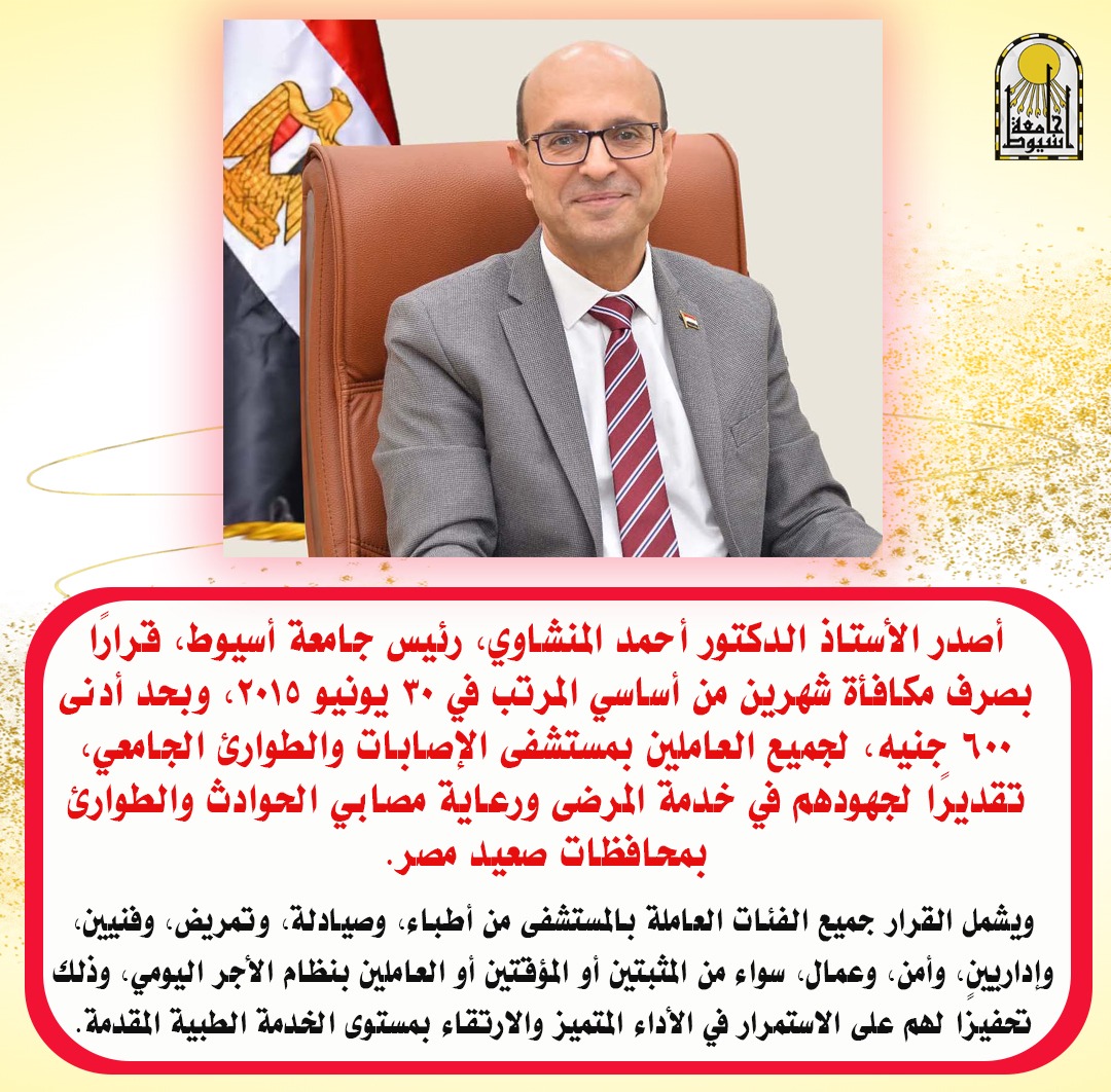 قرر الدكتور أحمد المنشاوي، رئيس جامعة أسيوط، صرف مكافأة مالية قدرها شهرين من أساسي المرتب في 30 يونيو 2015، وبحد أدنى 600 جنيه، لجميع العاملين بمستشفى الإصابات والطوارئ الجامعي، وذلك تقديرًا لجهودهم المتواصلة والمتميزة في خدمة المرضى ورعاية مصابي الحوادث والطوارئ من مختلف محافظات صعيد مصر.
