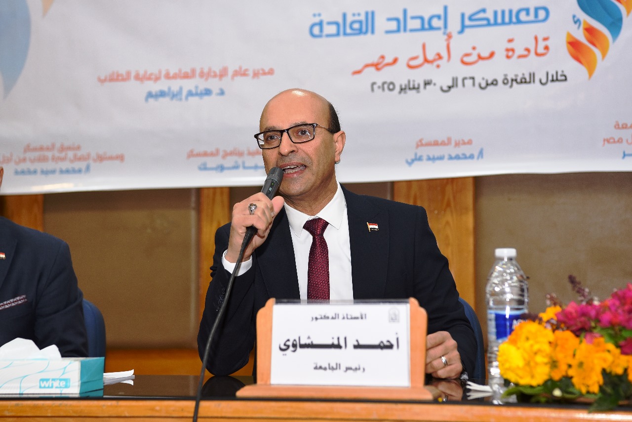 وفى مستهل كلمته، أعرب الدكتور أحمد المنشاوي؛ عن سعادته بالمشاركة فى هذا المعسكر المتميز؛ مشيدًا بنشاطه المشرف؛ في الشكل، والمضمون، والذي يعبر بوضوح عن حجم المجهود المبذول من اللجنة المنظمة، وكافة المشاركين؛ سواء أسرة طلاب من أجل مصر، واتحاد طلاب الجامعة، وإدارة إعداد القادة ورعاية المتميزين، بالإدارة العامة لرعاية الطلاب.