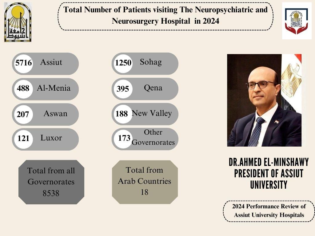 ورصد التقرير؛ عدد المرضى المترددين على المستشفى من مختلف المحافظات؛ حيث بلغ(8538) حالة، تضمنت من محافظة أسيوط (5716) حالة، ومن محافظة سوهاج (1250)، ومن محافظة المنيا (488)، ومن محافظة قنا (395)، ومن محافظة الأقصر (121)، ومن محافظة أسوان (207)، و (188) حالة من محافظة الوادي الجديد، و (173) حالة من المحافظات الأخرى، و(18) حالة من الوافدين من مختلف الدول العربية.