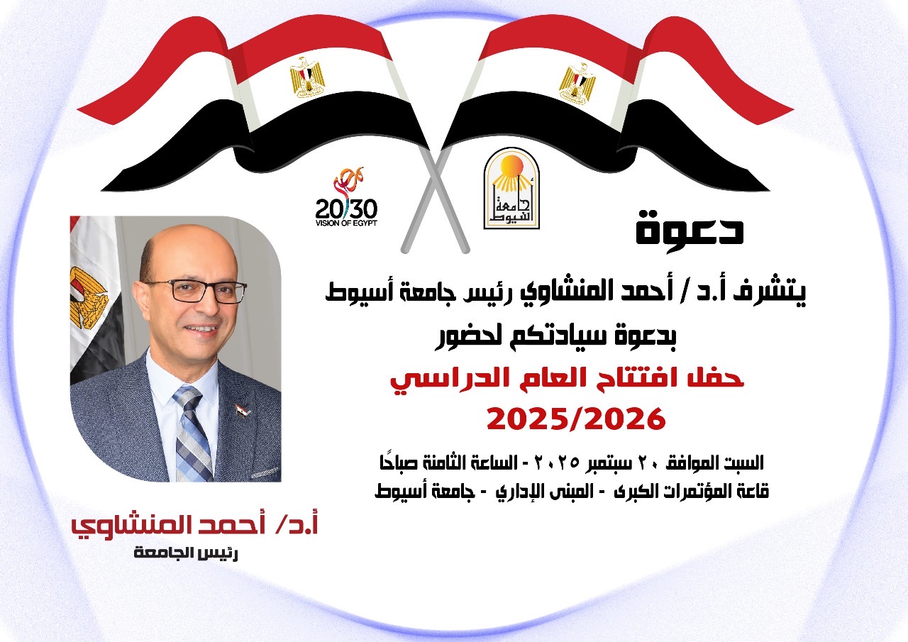 تحت رعاية الدكتور أحمد المنشاوي، رئيس جامعة أسيوط، تنظم الجامعة يوم السبت المقبل الموافق 20 سبتمبر، حفل افتتاح العام الدراسي الجديد 2025/2026 وتحية العلم، في تمام الساعة الثامنة صباحاً أمام المبنى الإداري للجامعة.