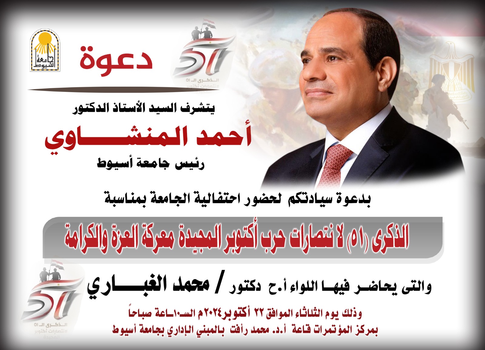 تشهد جامعة أسيوط؛ يوم الثلاثاء الموافق ٢٢ من أكتوبر، تحت رعاية الدكتور أحمد المنشاوي رئيس الجامعة؛ احتفالية كبرى بالذكرى (٥١) لانتصارات أكتوبر المجيدة، وندوة تثقيفية، يحاضر خلالها؛ اللواء الدكتور محمد الغباري مستشار مدير أكاديمية ناصر العسكرية، بعنوان: "التخطيط الإستراتيجي للحرب، والدفاع الإستراتيجي"، وذلك بقاعة المؤتمرات الكبرى بالمبنى الإداري بالجامعة.