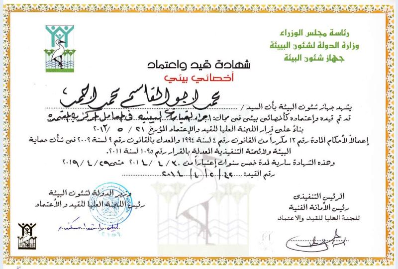 اعتماد السيد الأستاذ الدكتور/ محمد أبوالقاسم محمد (عميد كلية الهندسة ) أخصائى بيئى من وزارة الدولة لشئون البيئة