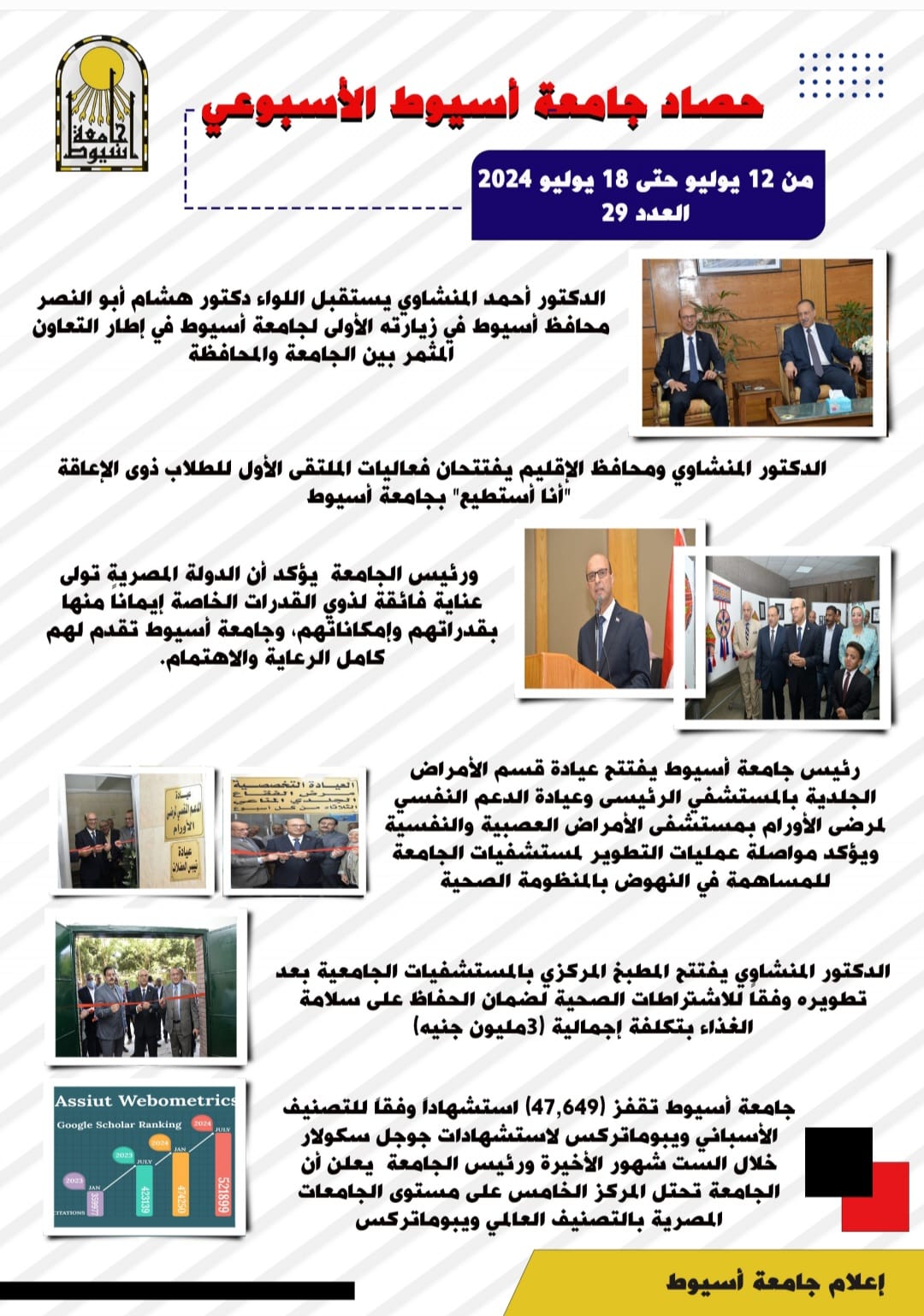 وجامعة أسيوط تقفز (47,649) استشهاداً وفقاً للتصنيف الأسباني ويبوماتركس لاستشهادات جوجل سكولار خلال الست شهور الأخيرة، وأعلن رئيس الجامعة، أن الجامعة تحتل المركز الخامس على مستوى الجامعات المصرية بالتصنيف العالمي ويبوماتركس.