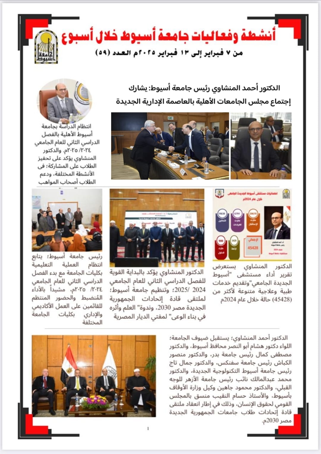 أصدرت جامعة أسيوط، بالانفوجراف حصادها الأسبوعي، لأهم الأنشطة والبرامج والفعاليات، خلال أسبوع، في الفترة من 7 فبراير حتى 13 فبراير 2025م؛ حيث شارك الدكتور أحمد المنشاوي رئيس جامعة أسيوط؛ اجتماع مجلس الجامعات الأهلية بالعاصمة الإدارية الجديدة، مشيدًا بانتظام الدراسة في جامعة أسيوط الأهلية خلال الفصل الدراسي الثاني للعام الجامعي 2024/2025، ومؤكدًا على أهمية تحفيز الطلاب للمشاركة في الأنشطة المختلفة ودعم المواهب المتميزة.
