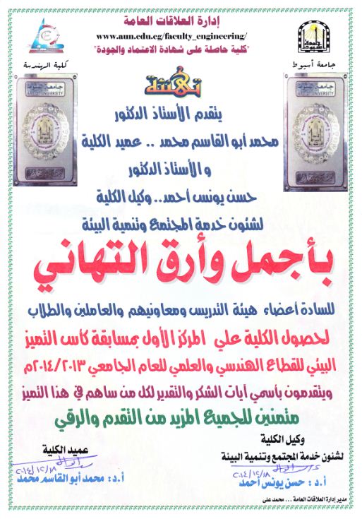 فوز كلية الهندسة بالمركز الأول بمسابقة كأس التميز البيئي للقطاع الهندسى والعلمى