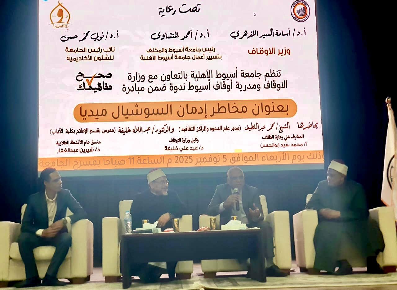نظمت جامعة أسيوط الأهلية اليوم الأربعاء الموافق 5 نوفمبر 2025، ندوة توعوية بعنوان "مخاطر إدمان السوشيال ميديا"، وذلك في إطار المبادرة الوطنية "صحح مفاهيمك" التي أطلقتها وزارة الأوقاف المصرية تنفيذًا لتوجيهات فخامة الرئيس عبد الفتاح السيسي رئيس الجمهورية، وتحت رعاية الدكتور مصطفى مدبولي رئيس مجلس الوزراء.