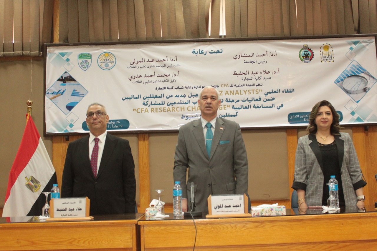 شهدت جامعة أسيوط انطلاق فعاليات اللقاء العلمي "GEN ZANALYSTS" تحت شعار "جيل جديد من المحللين الماليين"، والذي نظمته اللجنة العلمية لبرنامج CFA بكلية التجارة، وذلك برعاية الدكتور أحمد المنشاوي، رئيس الجامعة، في إطار فعاليات تقييم الطلاب المشاركين في الموسم الثاني من المسابقة العالمية CFA Research Challenge لعام 2025/2026، والتي تمثل فيها جامعة أسيوط مصر على المستوى الدولي.