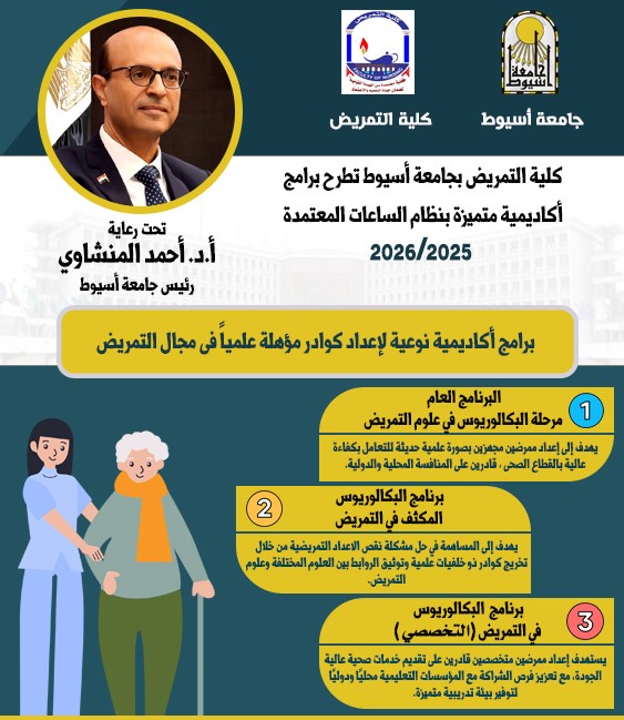 تحت رعاية الدكتور أحمد المنشاوي، رئيس جامعة أسيوط، أعلنت كلية التمريض عن بدء العمل بثلاثة برامج دراسية متميزة بنظام الساعات المعتمدة للعام الجامعي 2025/2026، وذلك بإشراف الدكتور أحمد عبد المولى، نائب رئيس الجامعة لشئون التعليم والطلاب، والدكتورة فاطمة رشدي، القائم بعمل عميد الكلية ووكيل الكلية لشئون التعليم والطلاب، والدكتورة نادية عبد الغني، أستاذ التمريض النفسي ومدير البرنامج التخصصي.