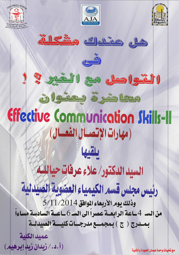 محاضرة عن (مهارات الاتصال الفعال) يلقيها السيد الدكتور/ علاء عرفات حيالله بكلية الصيدلة بعنوان "Effective Communication Skills" يوم الأربعاء الموافق 5/11/2014م.