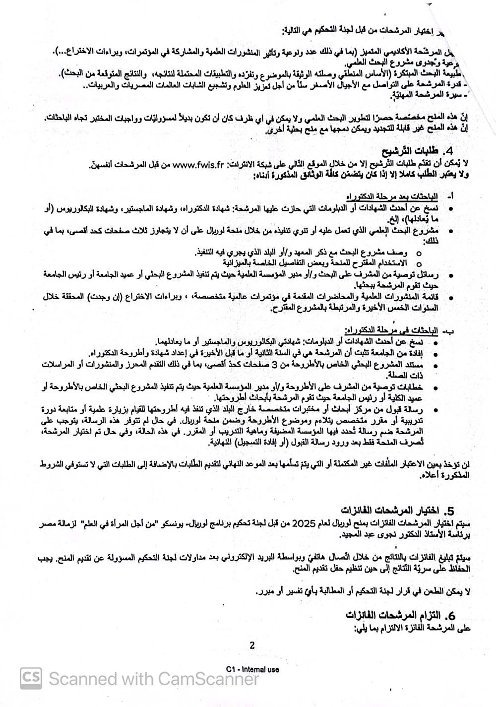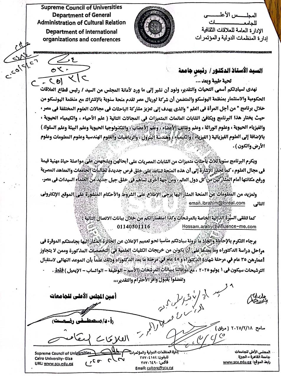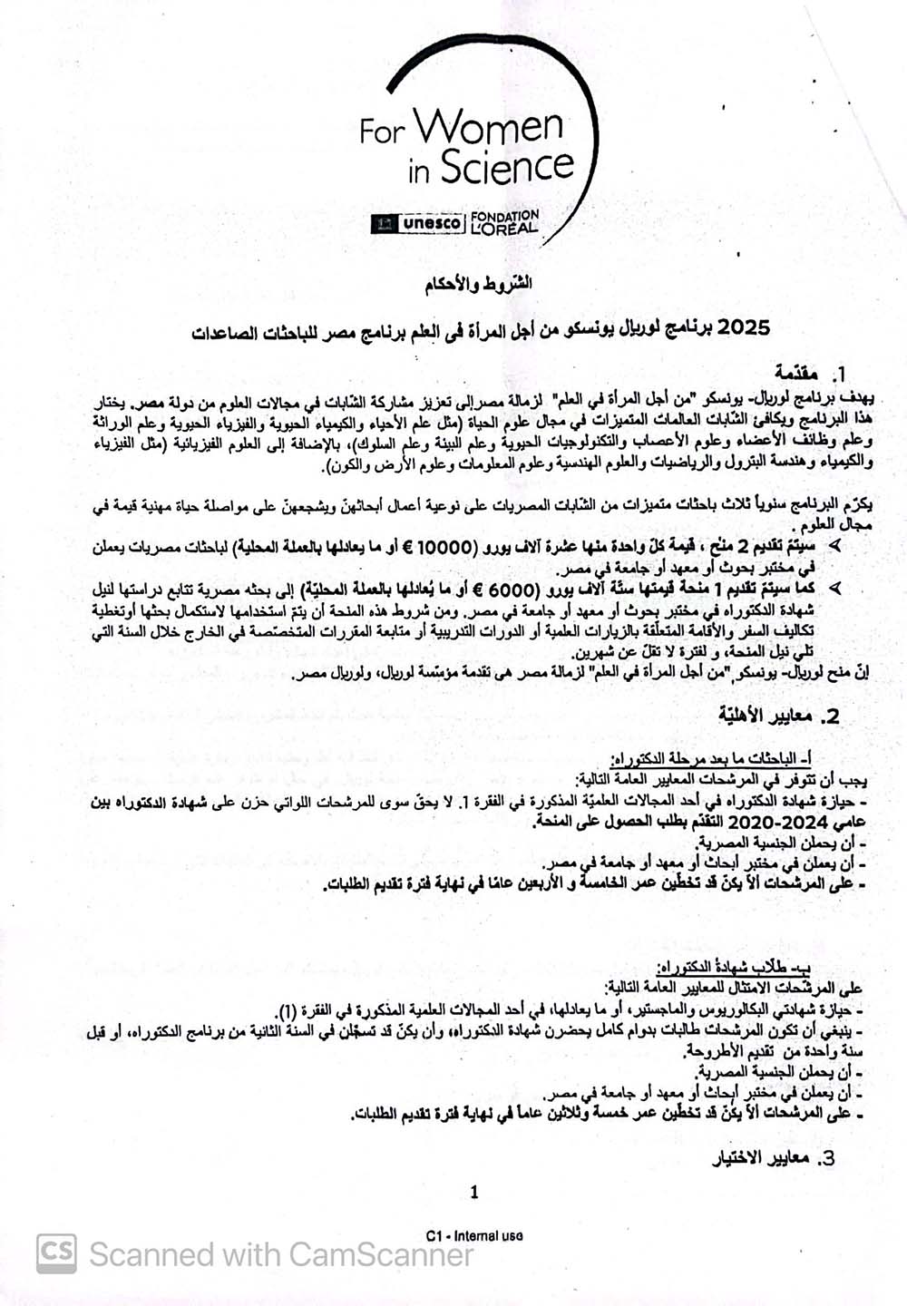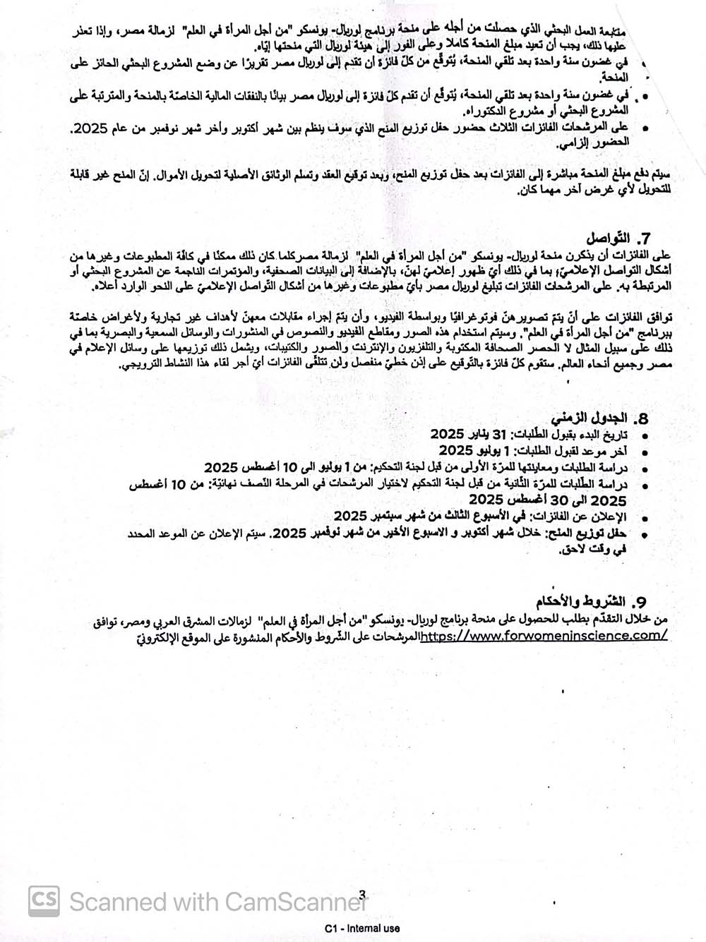 تقدم شركة لوريال مصر بالاشتراك مع منظمة اليونسكو منحة من خلال برنامج "من أجل المرأة في العلم" والذي يهدف إلى تعزيز مشاركة الباحثات في مجالات العلوم المختلفة في مصر حيث يختار هذا البرنامج ويكافئ الشابات العالمات المتميزات في المجالات التالية ( علم الأحياء- الكيمياء الحيوية- الفيزياء الحيوية- علوم الوراثة- علم وظائف الأعضاء- علم الأعصاب- التكنولوجيا الحيوية وعلم البيئة وعلم السلوك) بالإضافة إلى العلوم الفيزيائية ( الفيزياء- الكيمياء- هندسة البترول- الرياضيات والعلوم الهندسية وعلوم المعلومات وعلوم الأرض والكون)