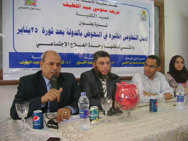تحت رعاية السيد الأستاذ الدكتور/ شريف سنوسى عبد اللطيف – عميد الكلية قامت ادراة العلاقات العامة بتوثيق الندوة التى عقدتها وحدة العلاج الاجتماعى بالكلية بعنوان " العمل التطوعى وتأثيره فى النهوض بالدولة بعد ثورة 25 يناير " بتاريخ 16/4/2013 فى تمام الساعه التاسعه والنصف صباحا بمدرج(3) بالكلية وحتى الساعه الحادية عشر والنصف صباحا .