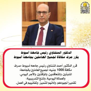 قرر الدكتور أحمد المنشاوي رئيس جامعة أسيوط؛ صرف مكافأة؛ للعاملين بأقسام الجامعة المختلفة؛ من المثبتين، والمتعاقدين، والمؤقتين، والأجر اليومي، والعمالة اليومية، والمنح التدريبية، قدرها (١٠٠٠) جنيه،…