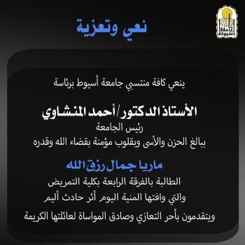 ببالغ الحزن والأسى، ينعى الدكتور أحمد المنشاوي، رئيس جامعة أسيوط، الطالبة ماريا جمال رزق الله بالفرقة الرابعة بكلية التمريض، جامعة أسيوط، التي وافتها المنية إثر حادث أليم، حيث وقع تصادم بين ميكروباص…