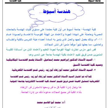 كلية الهندسة - جامعة أسيوط هي أول كلية معتمدة على مستوي كليات الهندسة بالجامعات المصرية وحاصلة على شهادة الجودة والاعتماد من الهيئة القومية للاعتماد والجودة عام٢٠١١ م، وذلك بفضل الجهد والعمل…