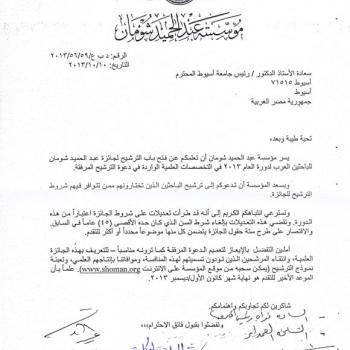 يسر مؤسسة عبد الحميد شومان أن تعلمكم عن فتح باب الترشيح لجائزة عبد الحميد شومان للباحثين العرب لدورة العام 2013 في التخصصات العلمية الآتية: