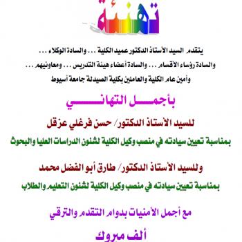 كلية الصيدلة تتقدم بخالص التهنئة للسيد الأستاذ الدكتور/ حسن فرغلي عزقل بمناسبة تعيين سيادته في منصب وكيل الكلية لشئون الدراسات العليا والبحوث ، وللسيد الأستاذ الدكتور/ طارق أبو الفضل محمد بمناسبة…