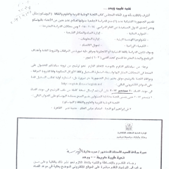 قد ورد للإدارة المركزية للعلاقات الثقافية ولأمانة المجلس كتاب اللجنة الوطنية للتربيةوالعلوم الثقافة بشأن تقديم الجمهورية التشيكية عدد (1 )منح للدراسة الجامعية بدولتها لصالح عدد معين من الأعضاء…