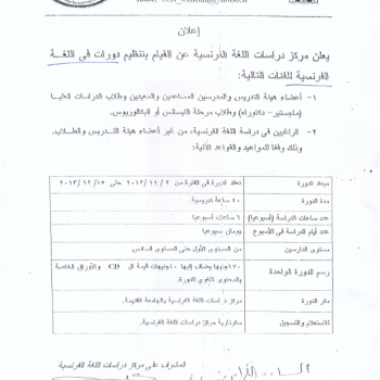 يعلن مركز دراسات اللغة الفرنسية عن دورات جديدة للغة الفرنسية للفئات التالية اعضاء هيئة التدريس والمدرسين المساعدين والمعيدين وطلاب الدراسات العليا وطلاب مرحلة الليسانس او البكالوريوس الراغبين فى…