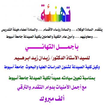 يتقدم السيد الاستاذ الدكتور عميد الكلية والسادة وكلاء الكلية والسادة اعضاء هيئة التدريس ومعاونيهم والسادة العاملين بخالص التهنئة للسيد الأستاذ الدكتور / محمد عبد السميع عيد بمناسبة انتخاب سيادته…