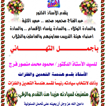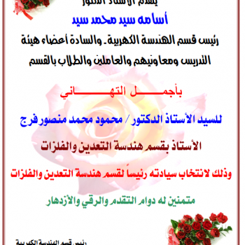 تهنئة مقدمة من ادارة كلية الهندسة والسادة أعضاء هيئة التدريس بالكلية للسيد الأستاذ الدكتور / محمود محمد منصور فرج بمناسبة انتخابة رئيس لقسم هندسة التعدين والفلزات