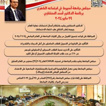 - د. المنشاوي يشيد بامتحانات نهاية العام ويوجه إعلان النتائج عقب انتهاء الامتحانات - مجلس الجامعة؛ يشيد بتقدم الجامعة في تصنيف CWUR لعام 2024 (31) مستوى عن العام السابق - مجلس الجامعة يثمن الأداء…