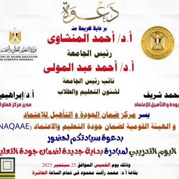 تتشرف جامعة أسيوط تحت رعاية الدكتور أحمد المنشاوي، رئيس الجامعة، بدعوتكم لحضور فعاليات اليوم التدريبي الأول لمبادرة "بداية جديدة لضمان جودة التعليم"، الذي ينظمه مركز ضمان الجودة والتأهيل للاعتماد…