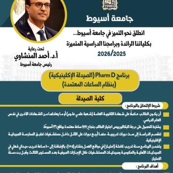 أعلنت كلية الصيدلة بجامعة أسيوط، تحت رعاية الدكتور أحمد المنشاوي رئيس الجامعة، عن بدء الدراسة ببرنامج Pharm D (الصيدلة الإكلينيكية) بنظام الساعات المعتمدة اعتبارًا من العام الجامعي 2025/2026، وذلك…