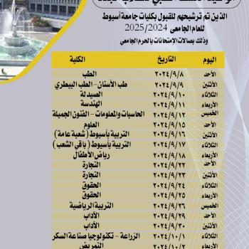 - د. المنشاوي: ضرورة التزام الطلاب بإجراء الكشف الطبي وفقاً للجدول الزمني المحدد لكل كلية - رئيس جامعة أسيوط: إعداد ملف صحي لكل طالب مستجد لمتابعة حالته الصحية طوال سنوات الدراسة بالجامعة   أعلن…