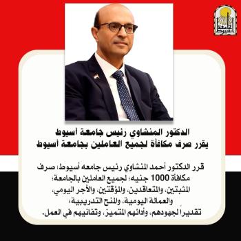 قرر الدكتور أحمد المنشاوي رئيس جامعه أسيوط؛ صرف مكافأة 1000 جنيه؛ لجميع العاملين بالجامعة؛ المثبتين، والمتعاقدين، والمؤقتين، والأجر اليومي، والعمالة اليومية، والمنح التدريبية؛ تقديراً لجهودهم،…